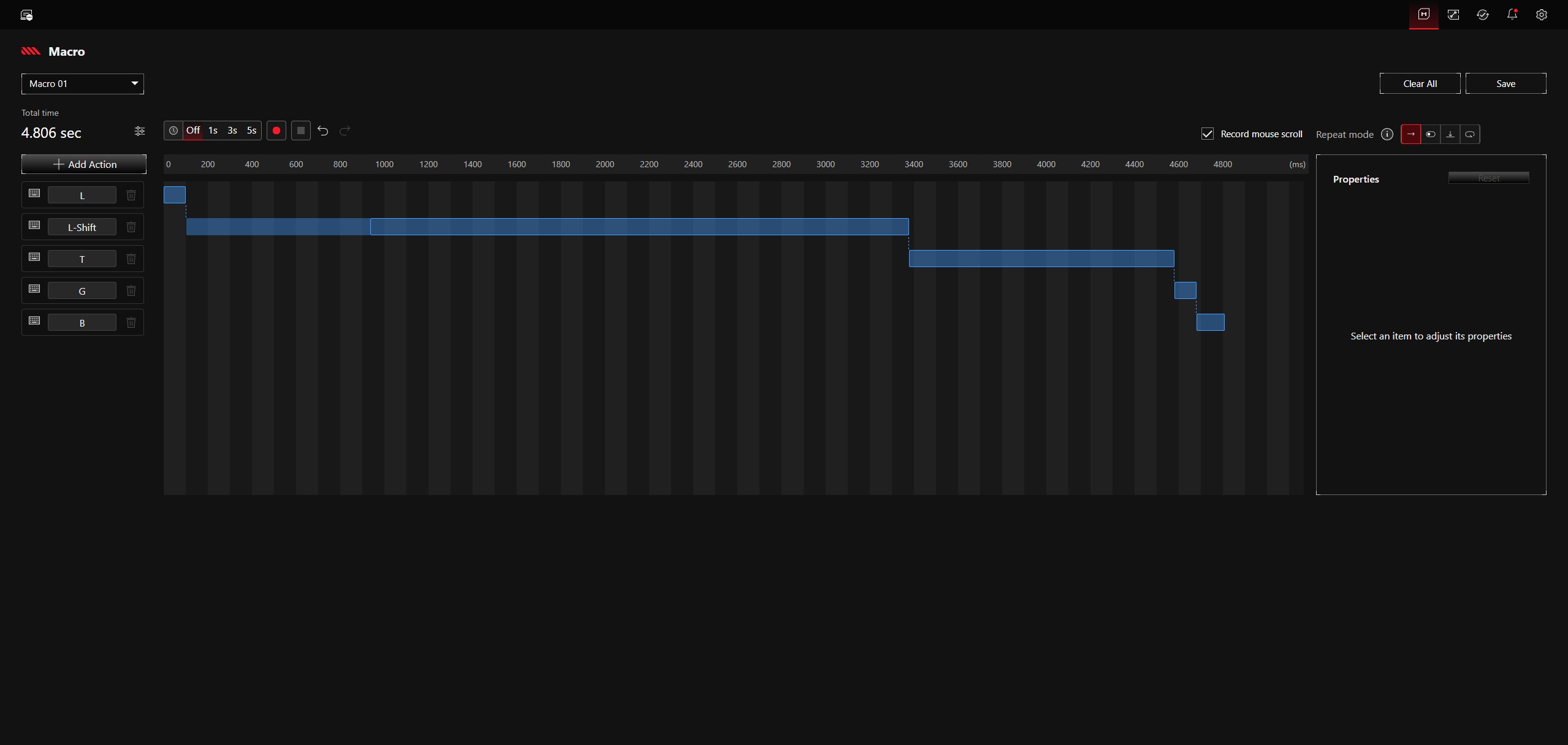 Gear Link funciona bien, es estable y, en general, ofrece muchas funciones, pero también es nuestro mayor punto de crítica, al menos por ahora. Aunque existe un editor de macros, éstas sólo podrán asignarse al Asus ROG Azoth 96 HE en una futura versión de Gear Link, prevista para el primer trimestre de 2026. Las macros ya se pueden grabar con software de terceros, por supuesto, pero se trata de una función que debería estar disponible en el momento del lanzamiento en un producto premium. También existe una segunda limitación de menor envergadura: actualmente no es posible lanzar programas arbitrarios, y esta función sólo está prevista para la segunda mitad del año. Como solución provisional, y en ausencia de asignación de programas, actualmente utilizamos el editor de macros sobre la marcha, que funciona bien, introduciendo el diálogo Ejecutar (Win+R) seguido de la ruta al archivo ejecutable. Naturalmente, esto limita la velocidad a la que se puede grabar manualmente la macro. Los usuarios también deben tener en cuenta que Gear Link es una interfaz web; según Asus, sólo funciona sin conexión si la vista general del dispositivo se abrió mientras estaba conectado a Internet y la pestaña del navegador permanece activa.