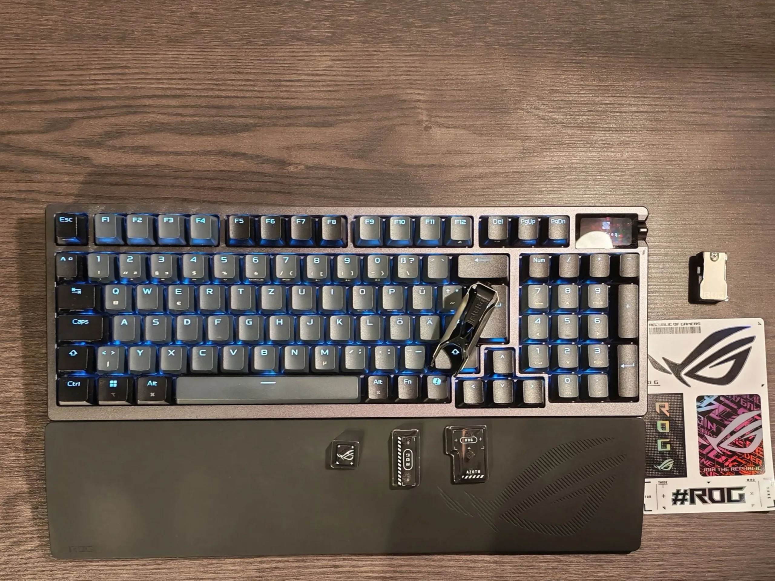 El número en el nombre del producto se refiere a la disposición: se trata de un teclado 96%. Como tal, no incluye todas las teclas típicas, lo que significa que se ha omitido el grupo de navegación de seis teclas. En comparación con un teclado estándar, la tecla Shift derecha es más pequeña de lo habitual, lo que en la práctica empuja las teclas de dirección hacia el bloque de teclas principal. La asignación de teclas por defecto para Imprimir pantalla también se ha ajustado en consecuencia. En principio, sin embargo, la asignación de teclas es totalmente personalizable, algo que volveremos a tratar más adelante. El teclado numérico está totalmente incluido, aunque la tecla 0 se ha acortado, lo que reduce el espacio entre el teclado numérico y la sección principal. Como resultado, el Asus ROG Azoth 96 HE es muy compacto con 382 × 136 mm sin ningún compromiso funcional real, mientras que el reposamuñecas añade aproximadamente otros 90 mm.