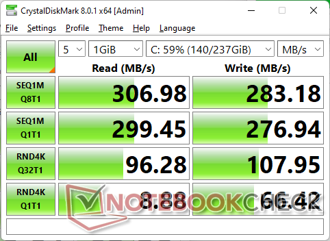 Sólo hay una ranura de almacenamiento interno y es compatible únicamente con unidades SSD M.2 SATA. El unidad Netac de 256 GB de nuestra unidad arrojaba unas tasas de lectura y escritura mediocres, de entre 300 y 500 MB/s cada una. La unidad parece tener problemas para mantener su máximo rendimiento durante largos periodos cuando se ejecuta DiskSpeed en bucle.