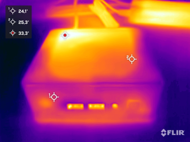 Como ocurre con muchos otros mini PC, la carcasa del Geekom A5 sólo se calienta ligeramente. El aire fresco se aspira por los laterales y se expulsa del aparato por la parte trasera. Con el AMD Ryzen 7 5800H, bajo carga, observamos temperaturas relativamente altas, lo que sugeriría que Geekom no está limitando el SoC térmicamente ni en términos de consumo de energía. El SoC alcanzó poco menos de 100 °C poco después del arranque. Este impulso a corto plazo provocó las altas temperaturas que también habíamos observado al analizar el bucle múltiple de Cinebench R15. En el transcurso continuado de la prueba de estrés, la temperatura de la CPU se estabilizó en unos nada críticos 89 °C. A 35 vatios bajo carga continua, el SoC funcionó a un nivel estable.