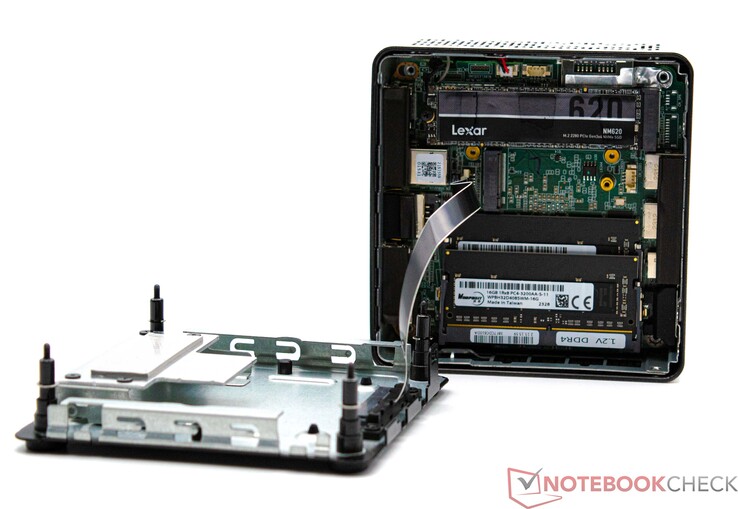 El Geekom A5 es muy fácil de abrir. La base está fijada por cuatro tornillos y sirve también para disipar el calor de la SSD. Dispone de una segunda ranura M.2, pero se echa en falta una almohadilla térmica en la parte trasera. Se pueden instalar un total de tres dispositivos de almacenamiento masivo, como en el caso delGeekom Mini IT11 o elGeekom Mini IT12. Para acceder al ventilador de la CPU, hay que seguir desmontando el aparato. Lamentablemente, no es posible realizar una limpieza rápida.
