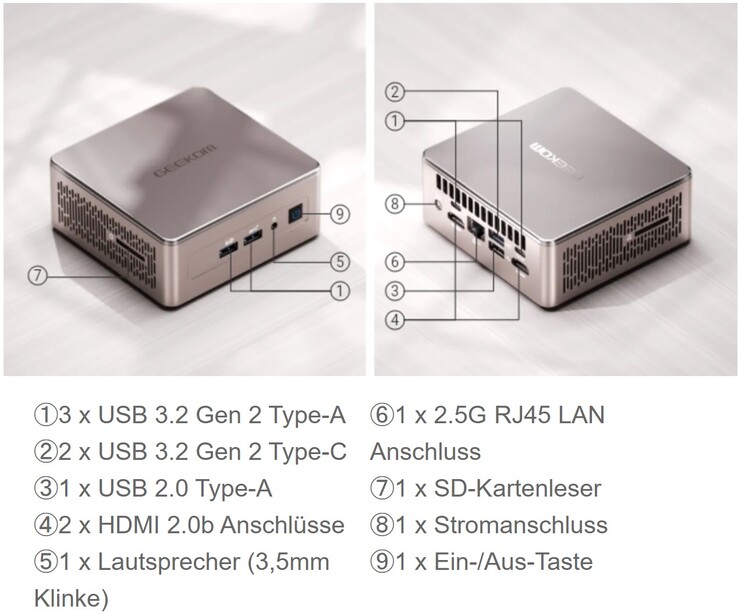En cuanto a la elección del procesador, elAMD Ryzen 7 5800Hes un SoC que ofrece un rendimiento adecuado. Aunque el procesador no pertenece a los modelos actuales de su clase, el chip de 8 núcleos puede estar a la altura de los procesadores más modernos. Con 32 GB de RAM, el Geekom A5 también está equipado con una generosa cantidad de RAM, aunque la unidad SSD de 512 GB tenga un tamaño más bien estándar. Geekom ha diseñado básicamente un buen mini PC que impresiona por su buena selección de puertos, aunque, por desgracia, Thunderbolt está ausente. En este ámbito, los modelos IT11 e IT12 disfrutan de una clara ventaja y esto también se refleja en el precio más elevado.