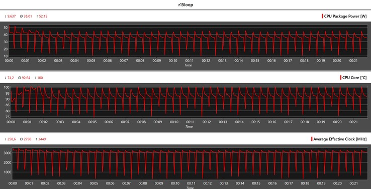 Con el bucle continuo Cinebench R15, obtuvimos nuestro primer vistazo a la eficiencia del sistema de refrigeración instalado y cómo interactúa con el consumo de energía del procesador. Inicialmente, observamos el mejor resultado que también iba acompañado del mayor consumo de energía. En cuanto a las temperaturas, sólo registramos 100 °C al inicio de la segunda ejecución. Esto significa que el rendimiento tuvo que reducirse un poco. Este destino afecta a casi todos los dispositivos que funcionan bajo carga continua. La reducción del rendimiento del Geekom A5 es significativamente menor y, en comparación, nuestra muestra de revisión obtuvo el mejor resultado en 50 ejecuciones (1.715 puntos). En la misma prueba, elMinisforum Serie Venus NAB6sólo consiguió una media de 1.627 puntos.
