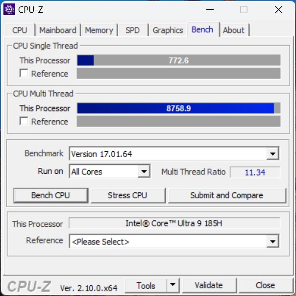 El Intel Core Ultra 9 185H no llega a los 100 °C en la prueba de estrés. De media, la temperatura cae en un rango no crítico. El valor máximo sólo se alcanza si el SoC hace uso del PL2.