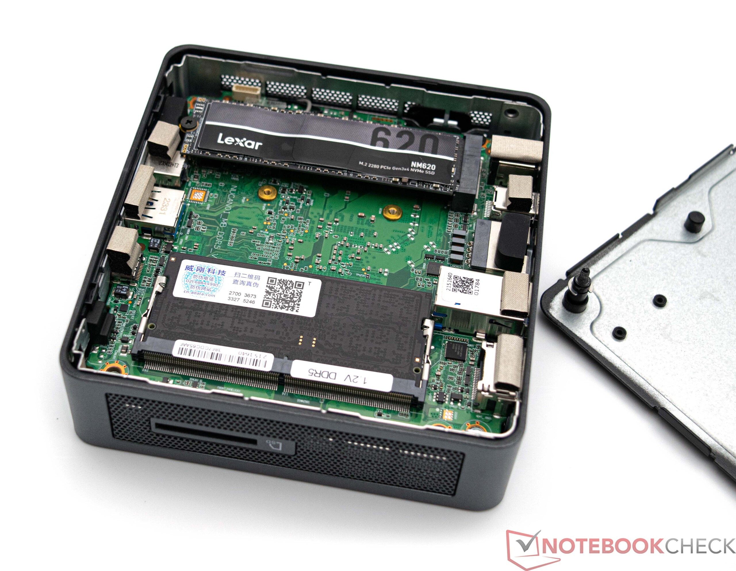 En el Geekom MiniAir 12 se ha instalado una unidad SSD de 512 GB de Lexar. El módulo instalado hace uso de la ranura M.2 y se conecta a través de PCIe 3.0 x4. A su vez, nuestro dispositivo de prueba obtuvo muy buenos resultados de rendimiento utilizando este dispositivo de almacenamiento. Sin embargo, documentamos algunos problemas de rendimiento continuos durante la prueba de estrés: el PC tuvo dificultades para mantener su rendimiento a un nivel constante debido a unas temperaturas demasiado elevadas. Por otro lado, incluso con estas limitaciones, el rendimiento de la unidad SSD de Lexar seguía siendo mejor que el de los dispositivos de comparación. Los competidores no tuvieron ninguna oportunidad y tuvieron que conformarse con resultados considerablemente peores. El MiniAir 12 no presenta ninguna opción para instalar un segundo dispositivo de almacenamiento. Como resultado, tendrá que conformarse con el almacenamiento de 512 GB instalado o cambiarlo por otra unidad SSD con más almacenamiento.