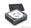 El Geekom MiniAir 12 tiene un aspecto similar al de los sistemas NUC de Intel y, de hecho, su construcción física también muestra muchas similitudes cuando se observa con detenimiento. Al igual que en el Geekom MiniAir 11, el fabricante ha recurrido a una mezcla de materiales compuesta por plástico y metal. Este último se utiliza para la construcción interna, lo que confiere al dispositivo una excelente estabilidad. Esto significa que la mayoría de los dispositivos de Geekom no pueden clasificarse como ligeros, ya que este modelo pesa unos 453 gramos, lo que lo convierte en el segundo más pesado dentro del campo de comparación. Su tamaño de 11 x 11 cm es bastante reducido, aunque existen dispositivos mucho más compactos. Su altura de construcción es impresionante, ya que sólo mide 3,5 cm. Como es sabido por Geekom, la calidad de construcción del PC es impecable.