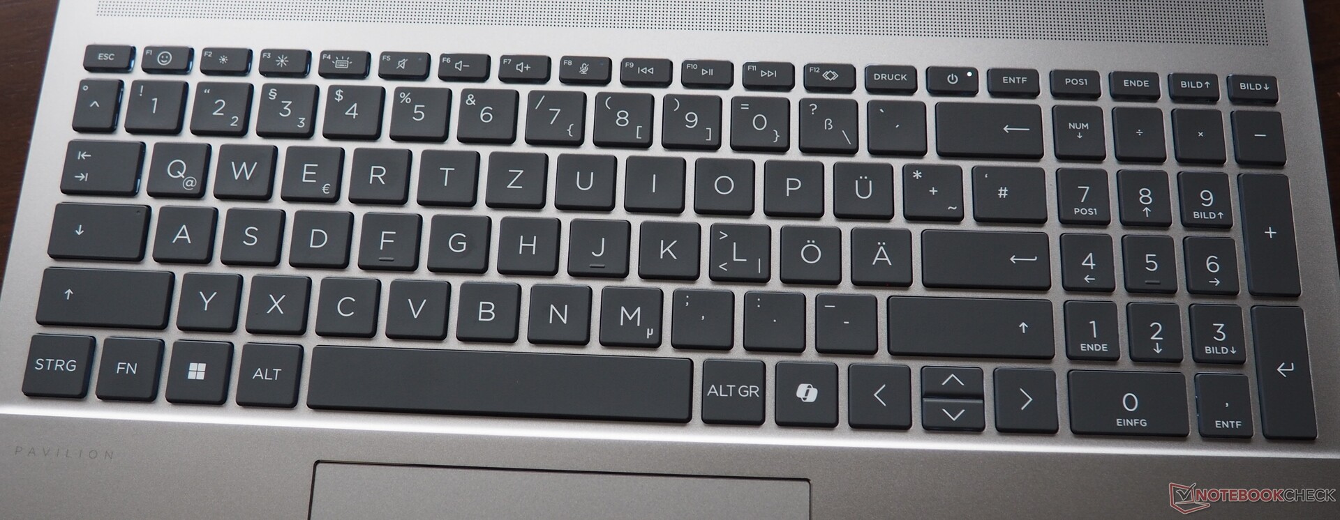 El teclado convence en la mayoría de las disciplinas. Para los estándares de un portátil o una cúpula de goma, las teclas ofrecen una respuesta bastante nítida, aunque no se puede comparar con un modelo mecánico. No obstante, la mayoría de los compradores estarán satisfechos con la sensación de tecleo. Sin embargo, hay que señalar que al teclear a veces se produce un ruido de traqueteo procedente de la carcasa, que puede resultar un poco molesto. La disposición tampoco es óptima. Por ejemplo, el botón de encendido no está situado en la esquina, sino que se pierde entre los botones de pulsación y borrado (en la foto se aprecian más desviaciones de la norma alemana). Por otro lado, el dispositivo de 16 pulgadas cuenta con un teclado numérico completo.