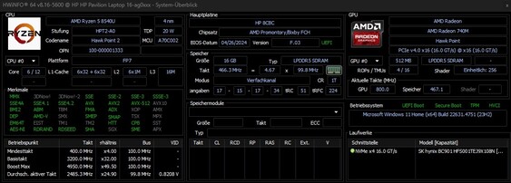 El modelo Pavilion 16 que probamos responde al nombre de ag0057ng y alberga el mencionado Ryzen 5 8540U así como 16 GB de RAM LPDDR5 6.400 y una SSD NVMe de 1 TB. La pantalla tiene un formato 16:10 y una resolución de 1.920 x 1.200 píxeles. HP preinstala Windows 11 Home como sistema operativo.