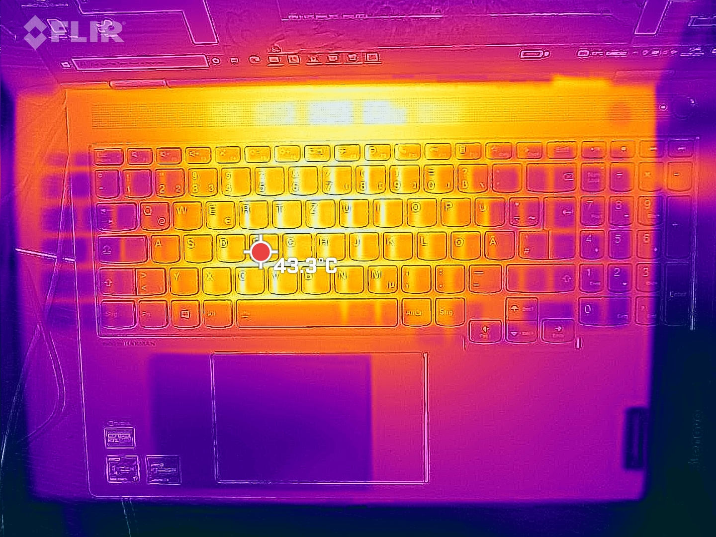 (-) Jugando a The Witcher 3, la temperatura media de la parte superior es de 40.6 °C / 105 F, frente a la media del dispositivo de 31.3 °C / 88 F.