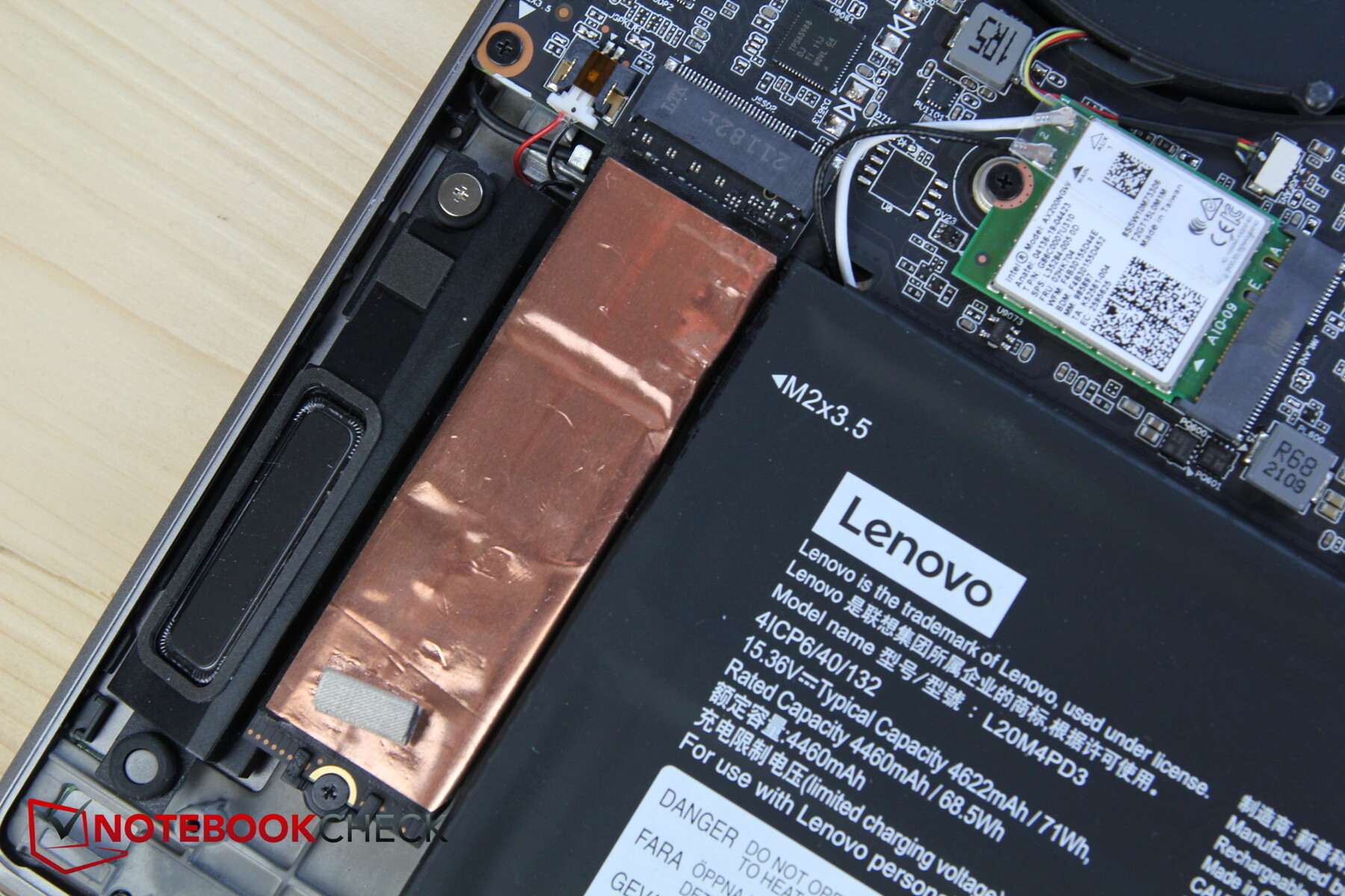Después de aflojar los tornillos, la cubierta inferior sigue estando muy firme en su lugar, y hay que abrirla con una herramienta adecuada. Después de eso, puedes acceder a los ventiladores, el módulo WLAN, la ranura RAM, y el SSD. Sin embargo, los dos últimos también están ocultos detrás de cubiertas protectoras que a menudo están recubiertas con placas de plástico o metal. Por ejemplo, hay una tira de plástico encima del SSD y otra de cobre para disipar el calor. En general, no es muy fácil acceder a los componentes debido al exceso de cubiertas.