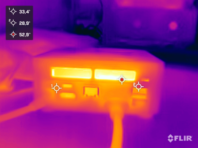 La carcasa del Minisforum Venus Series UN1245 sólo se calienta ligeramente cuando funciona en reposo y bajo carga. Los puntos calientes térmicos sólo se encuentran en la zona de las rejillas de ventilación de la parte trasera del dispositivo.