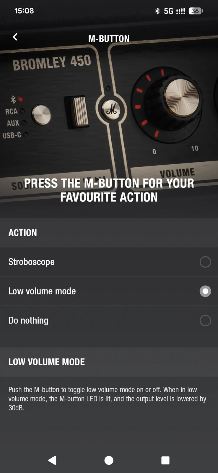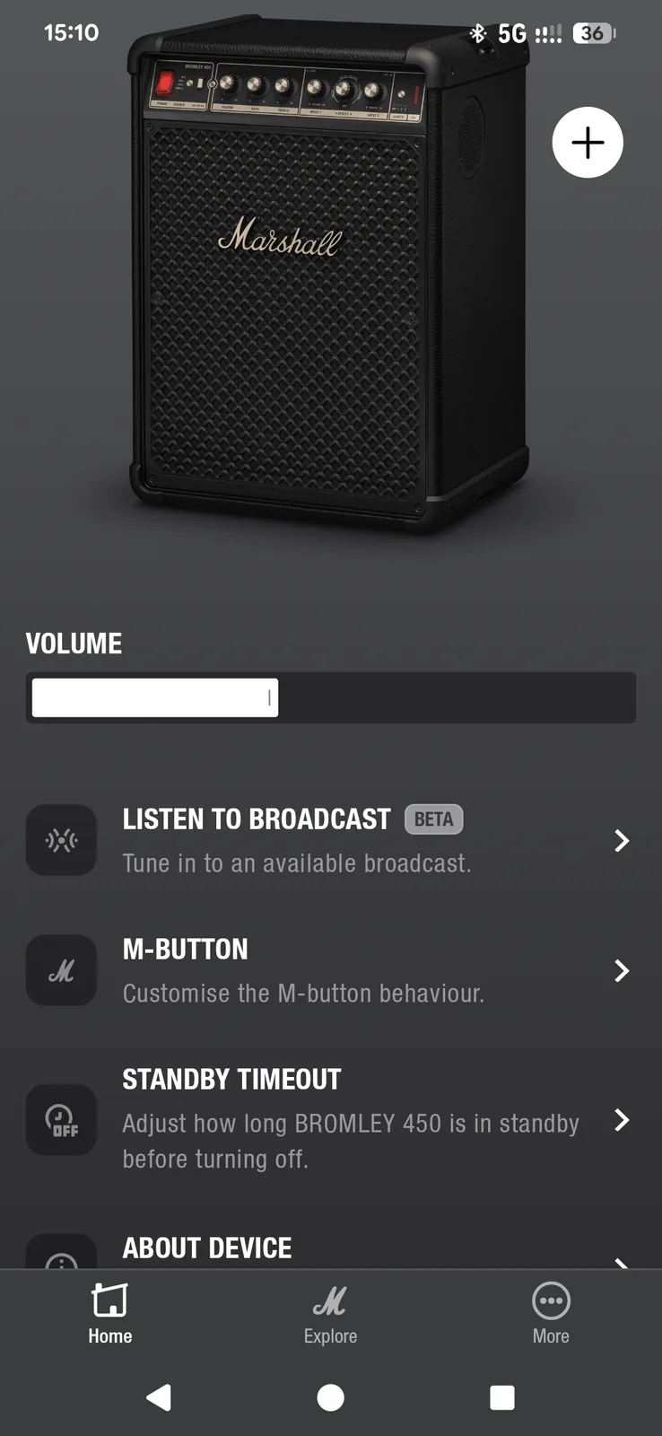 El Bromley utiliza la misma aplicación que los auriculares Marshall. La aplicación Bluetooth de Marshall tiene un aspecto limpio y es fácil de navegar, pero carece de funciones. La necesitará principalmente para Auracast (enlazar varios altavoces compatibles) y para configurar el botón M, que actualmente sólo admite una de las dos funciones asignables. Más allá del control de volumen, no hay mucho que pueda ajustar a distancia: ni ecualizador, ni ajustes de agudos o graves.