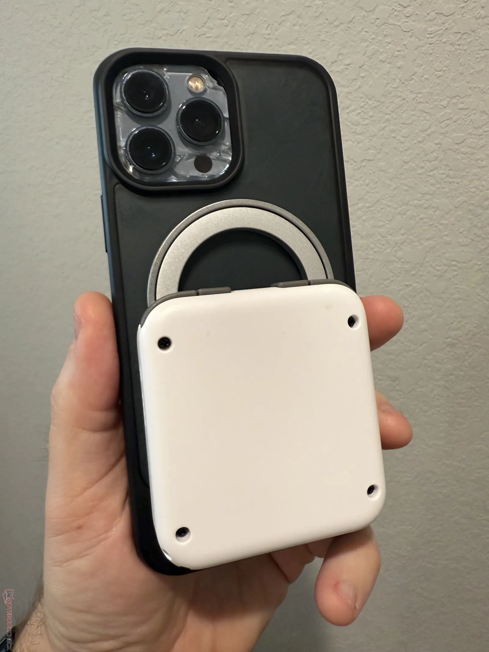 El imán es una pieza separada del mando, que se fija al imán y se alinea mediante una pequeña clavija en su parte superior. Sin embargo, esta clavija no es tan firme como cabría esperar, especialmente con teléfonos más grandes o pesados. En mis pruebas, un iPhone 13 se sintió bastante asegurado, pero un iPhone 13 Pro Max y un iPhone 16 Pro Max se sintieron tambaleantes y no asegurados con seguridad. Dicho esto, los teléfonos se mantuvieron en su sitio a menos que se sacudieran intencionadamente, en cuyo caso el anillo magnético se desprendió del mando.