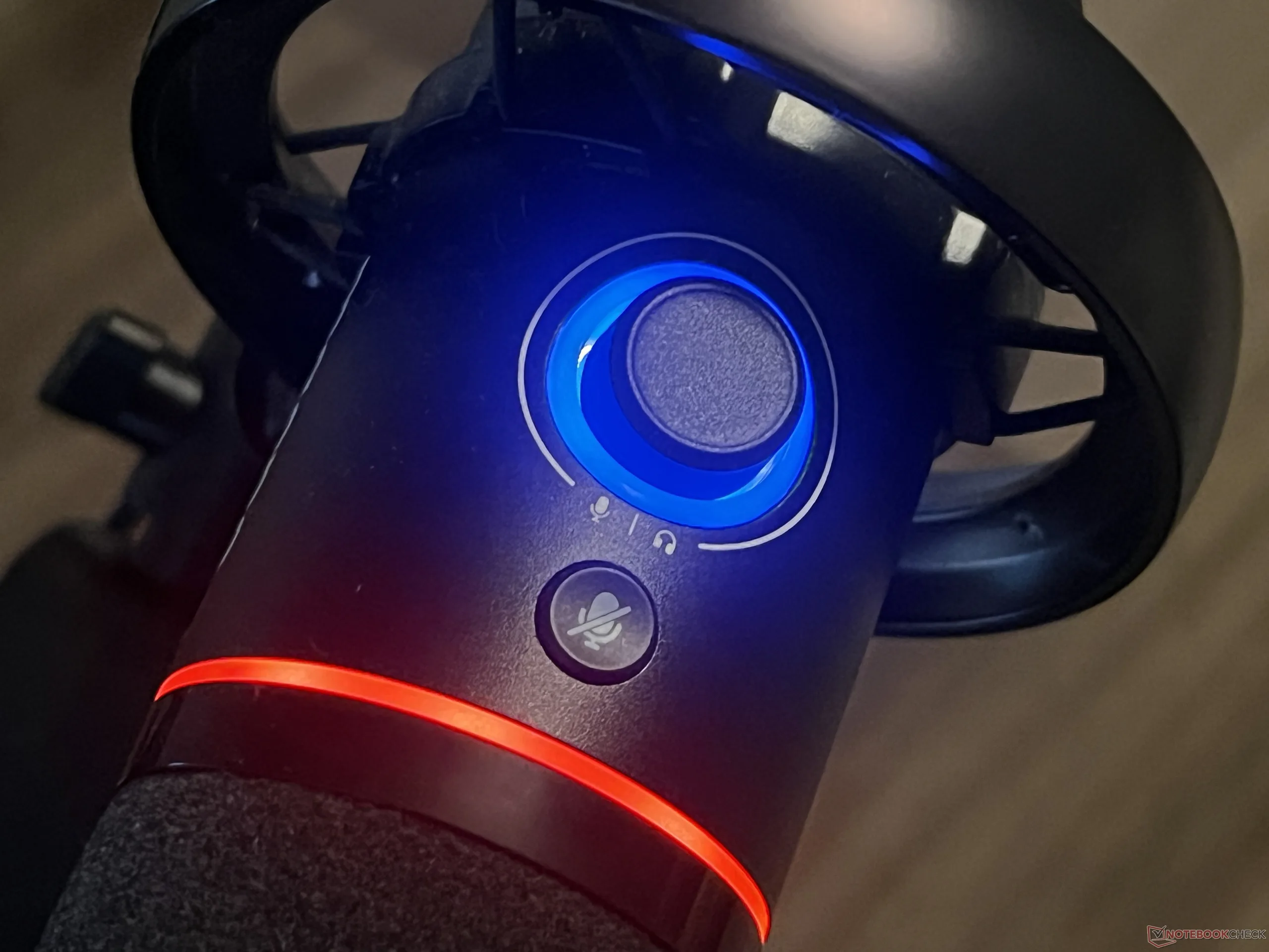 Hay un único mando en el cuerpo principal del micrófono que controla la ganancia (el volumen que entra en el micrófono) o el volumen de los auriculares (que sale a través de la toma de 3,5 mm situada en la parte inferior del cuerpo del micrófono). Hay un anillo de LED alrededor de esta luz que da una vaga idea de dónde están ajustados los niveles de ganancia o volumen, aunque no es muy preciso. La tapa se atenúa al bajar el volumen y se ilumina al subirlo, pero es difícil saber exactamente en qué porcentaje o nivel se encuentra el volumen. El mando tiene una buena respuesta táctil, haciendo clic en cada nivel. Como referencia, hay exactamente 20 clics del 0% al 100%, por lo que hay que contar los clics para hacerse una idea mejor y más exacta. Una señal visual más precisa sería una mejor opción en futuras revisiones, que permitiera a los usuarios saber de un vistazo a qué nivel está ajustada la ganancia.