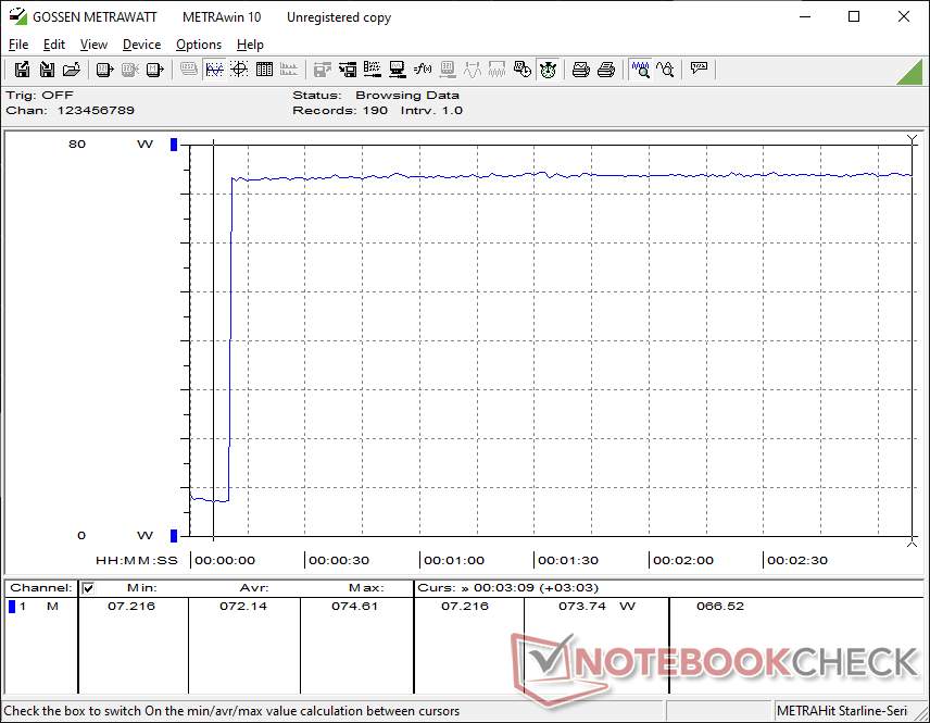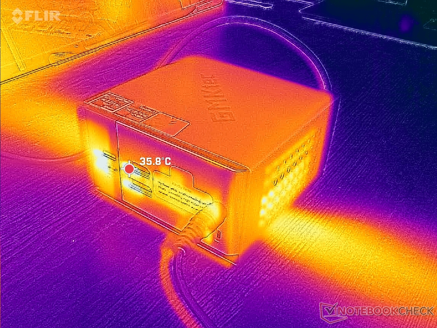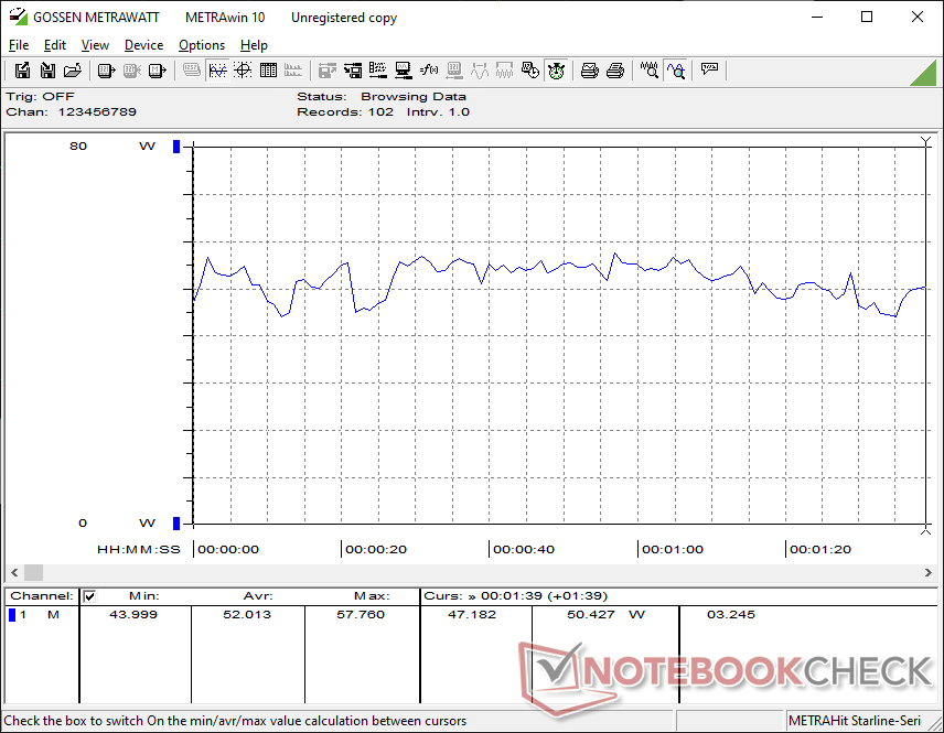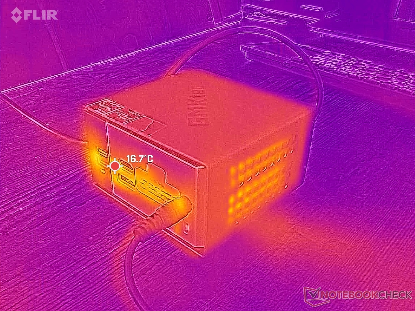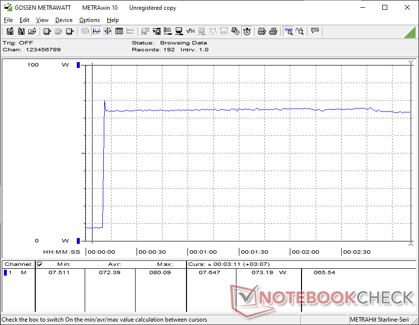 Hemos podido medir un consumo máximo de 80 W del adaptador de CA de 120 W de tamaño medio (~13,3 x 5,8 x 3,2 cm).