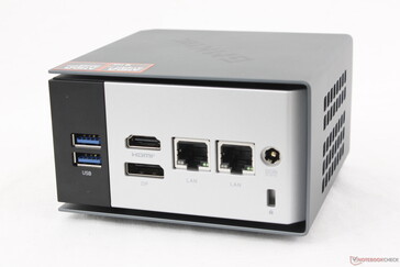El escape sale por los dos laterales del chasis en lugar de por la parte trasera, a diferencia de la gran mayoría de mini PC del mercado. Por tanto, no se recomienda colocar la unidad de lado sin el soporte vertical incluido para un flujo de aire óptimo. El aire fresco sigue entrando por las rendijas a lo largo del borde superior del chasis.