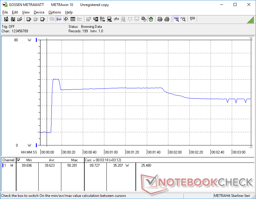 El sistema consume un poco más de energía que la mayoría de los Ultrabooks más nuevos, ya que usa una CPU AMD de generación anterior. La ejecución de cargas exigentes consumirá entre 40 W y 46 W en comparación con los 35 W y 42 W del Dell Inspiron 14 7400 oHP Pavilion 14 aunque el BMax viene con un rendimiento más lento. El menor rendimiento por vatio es un precio común a pagar cuando se eligen CPUs de generaciones anteriores.