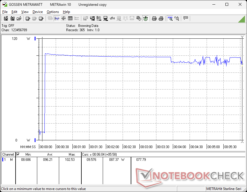 El consumo de energía en ralentí no es notablemente superior al del ThinkBook 16 G7 o el MSI Summit A16 AI equipados con procesadores Core-U y Ryzen AI 9, respectivamente. Sin embargo, al ejecutar Cyberpunk 2077, el consumo medio sería casi idéntico al del sistema MSI, a pesar de que nuestra GPU Intel es mucho más lenta, por lo que el rendimiento por vatio es inferior. También se pueden encontrar resultados similares al ejecutar Prime95.
