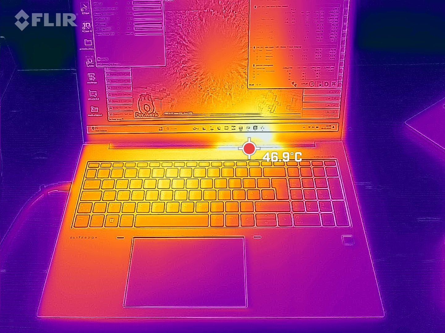 Detectamos puntos calientes de 50°C (122°F) en la parte inferior no sólo durante la prueba de estrés sino también durante los juegos. En tales escenarios de carga, que son bastante inusuales, el EliteBook ya no es adecuado para su uso en el regazo. Los competidores a menudo pueden mantenerse más fríos bajo carga. Dicho esto, las temperaturas no deberían ser un problema en el uso normal de oficina.