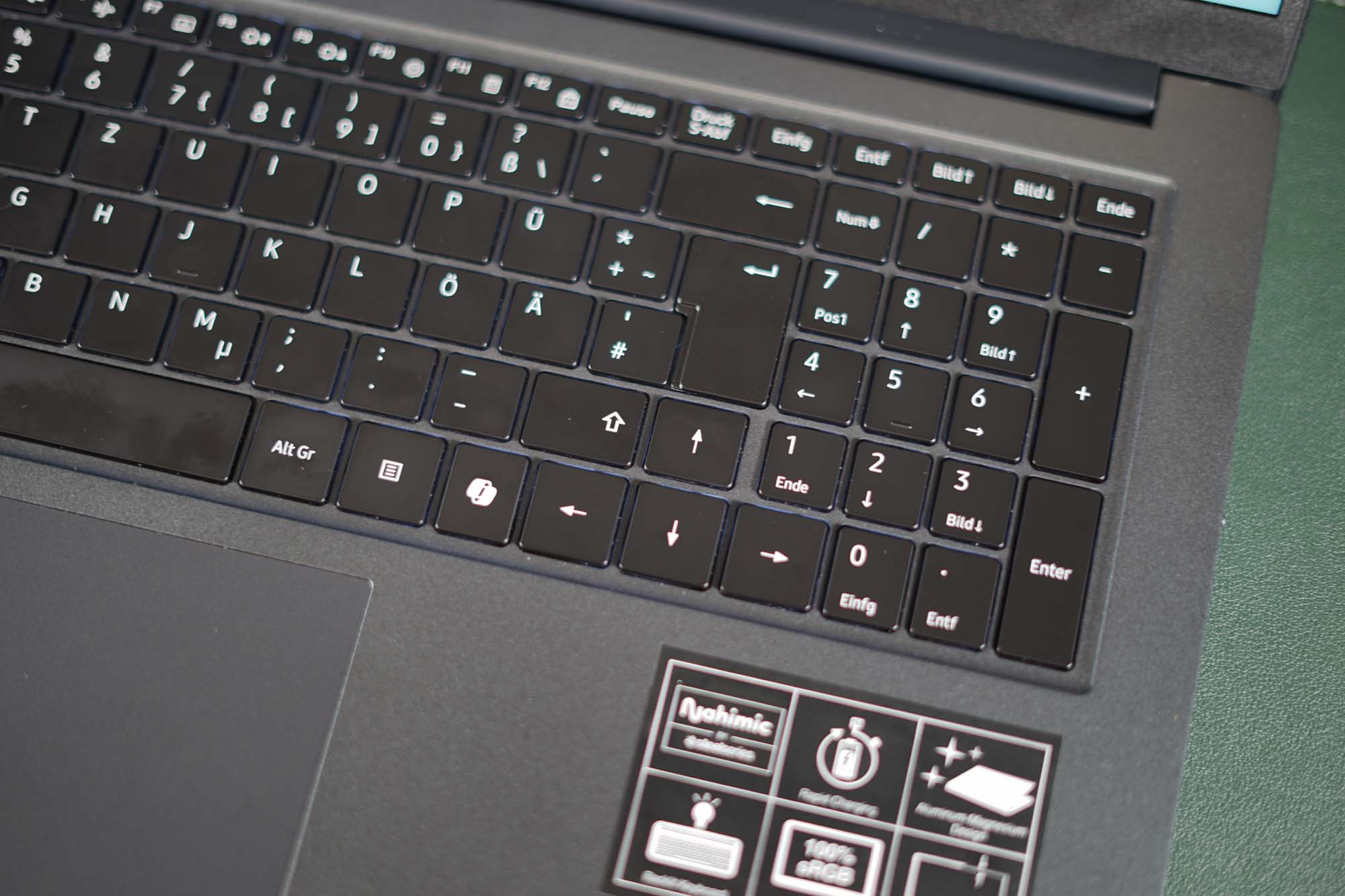 La gran carcasa del portátil Medion S20 tiene espacio para un teclado de tamaño completo con un teclado numérico de cuatro columnas. El teclado es de tipo chiclet y la sensación al escribir es muy buena, aunque el punto de presión podría ser un poco menos blando. También tuvimos problemas con la tecla 1 de nuestro modelo, que a menudo no respondía. Gracias a la robusta carcasa de aluminio y magnesio, el teclado no cede al escribir. También nos gustaron las teclas de flecha y Enter de tamaño normal.