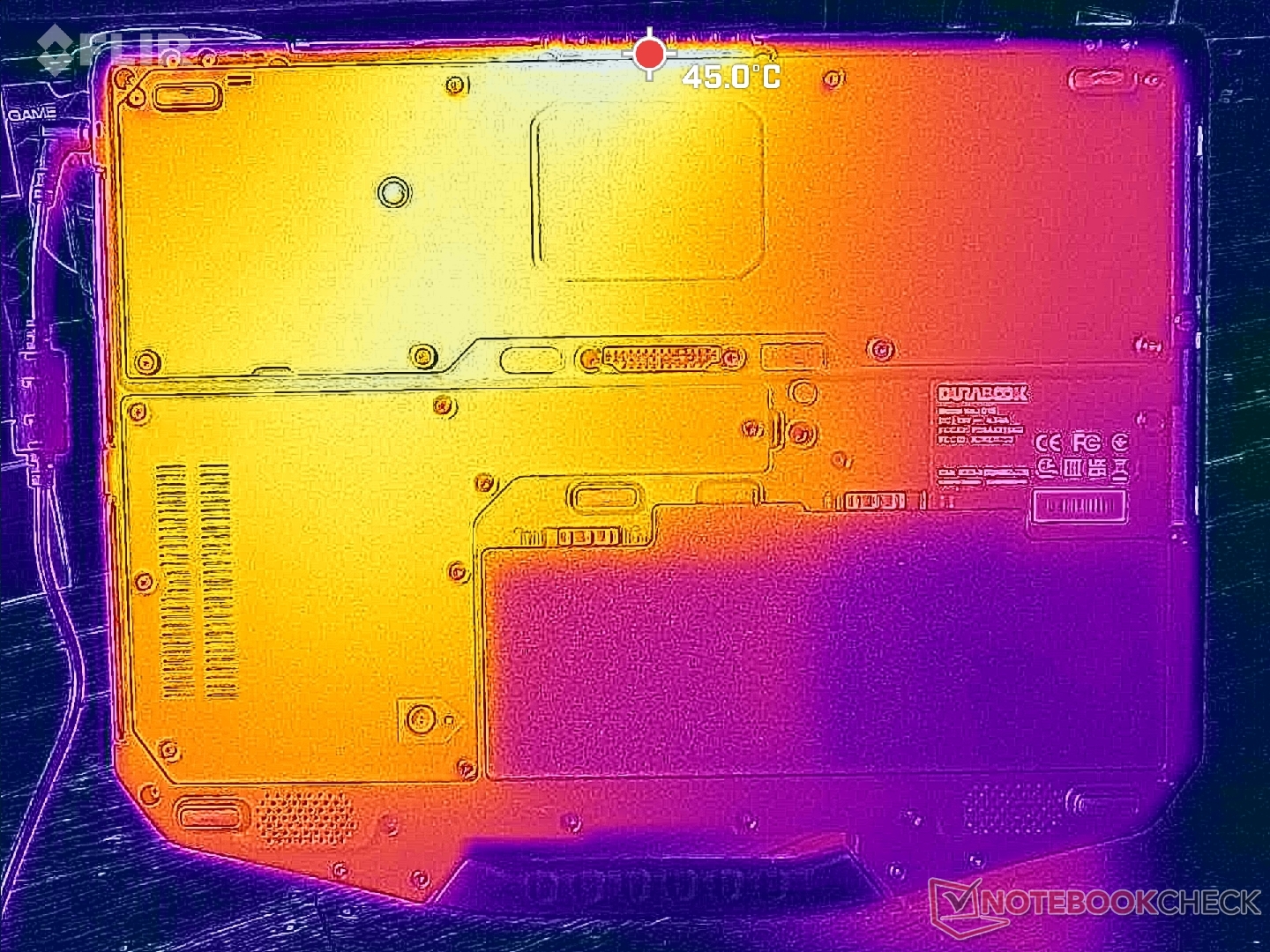 La mitad derecha del sistema siempre estará más caliente que la izquierda debido a la colocación de la batería y la solución de refrigeración. Los puntos calientes de la parte inferior pueden alcanzar algo más de 40 C, similar a la Panasonic Toughbook 40 o el antiguo Durabook S15ABG2.