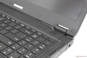 Visualmente, se han realizado algunos retoques en el chasis, incluido el nuevo color negro uniforme, un teclado más grande con numpad, una transición de superficie más suave entre la cubierta del teclado y el asa de transporte, y un posicionamiento revisado de los puertos debido a todos los cambios internos de la placa base. La calidad del chasis sigue siendo excelente como antes, salvo en la parte del teclado con teclado numérico, donde la superficie tiende a alabearse mucho más fácilmente al aplicar presión. El Getac S410, más grueso, nos parece más robusto, especialmente en las esquinas, ya que el Durabook no está recubierto de goma para una mejor protección contra las caídas.