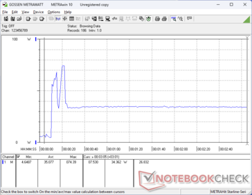 El consumo total cuando se ejecutan cargas más altas es ligeramente inferior que en la Getac S410 G5 que luce una CPU de la serie Core-P más rápida. El consumo máximo puede llegar temporalmente hasta los 77 W cuando la CPU se estresa antes de que entren en acción las limitaciones térmicas, como muestran los gráficos siguientes. El sistema es compatible con la mayoría de los adaptadores de CA USB-C genéricos, por lo que el adaptador de barril de CA propietario de 90 W (~15 x 6,4 x 2,6 cm) que se entrega en la caja no es absolutamente necesario.