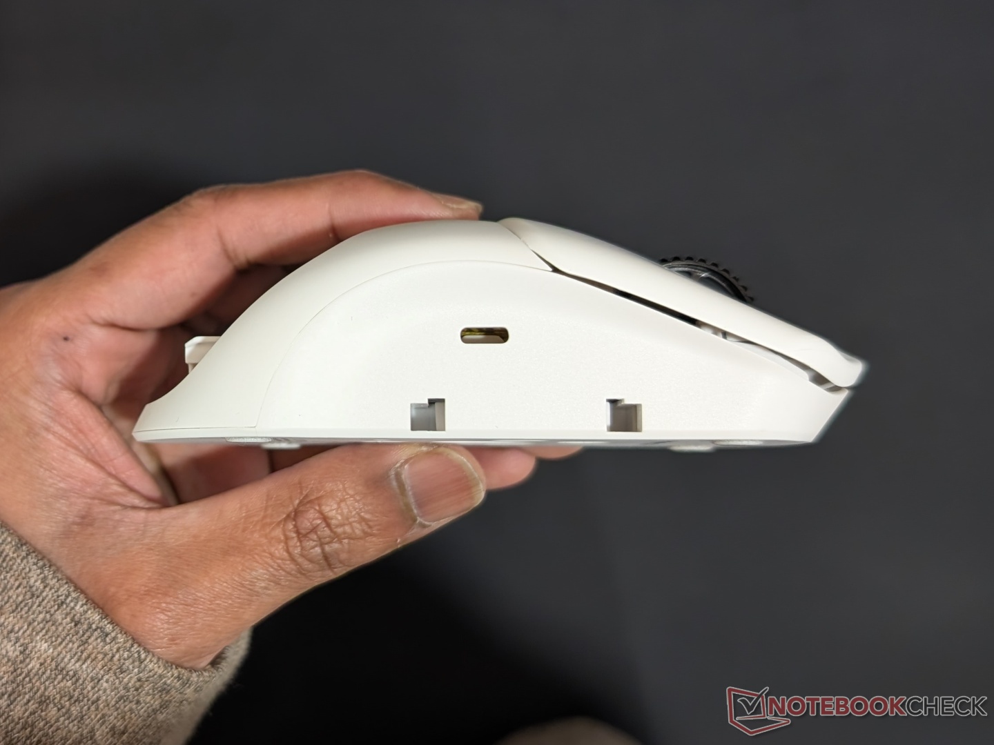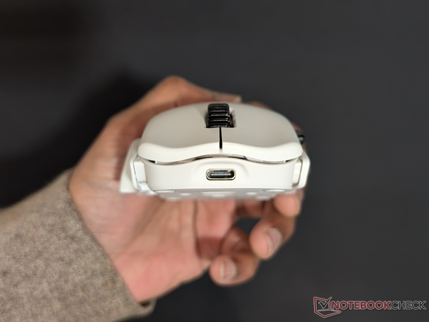 Hablando de eso, la duración de las pilas es bastante buena y cumple las afirmaciones de la empresa. Utilizando el ratón a 1.000 Hz de polling, dura fácilmente más de una semana, que es lo que afirma Orbital. Los 300 mAh se agotan mucho más rápido en los modos de 8.000 Hz y 4.000 Hz, sin ninguna mejora perceptible en la latencia. Hay una razón por la que incluso los profesionales se ciñen a 1.000 Hz. La carga con el cable USB Tipo-C incluido es muy rápida, pero el conector en ángulo le obliga a enchufarlo en una sola dirección. Probablemente sea, hasta cierto punto, una característica para evitar el arrastre del cable en el escritorio durante el funcionamiento con cable. El conector sí permite que el receptor esté más plantado en el escritorio con el cable cayendo naturalmente detrás de la superficie del escritorio.