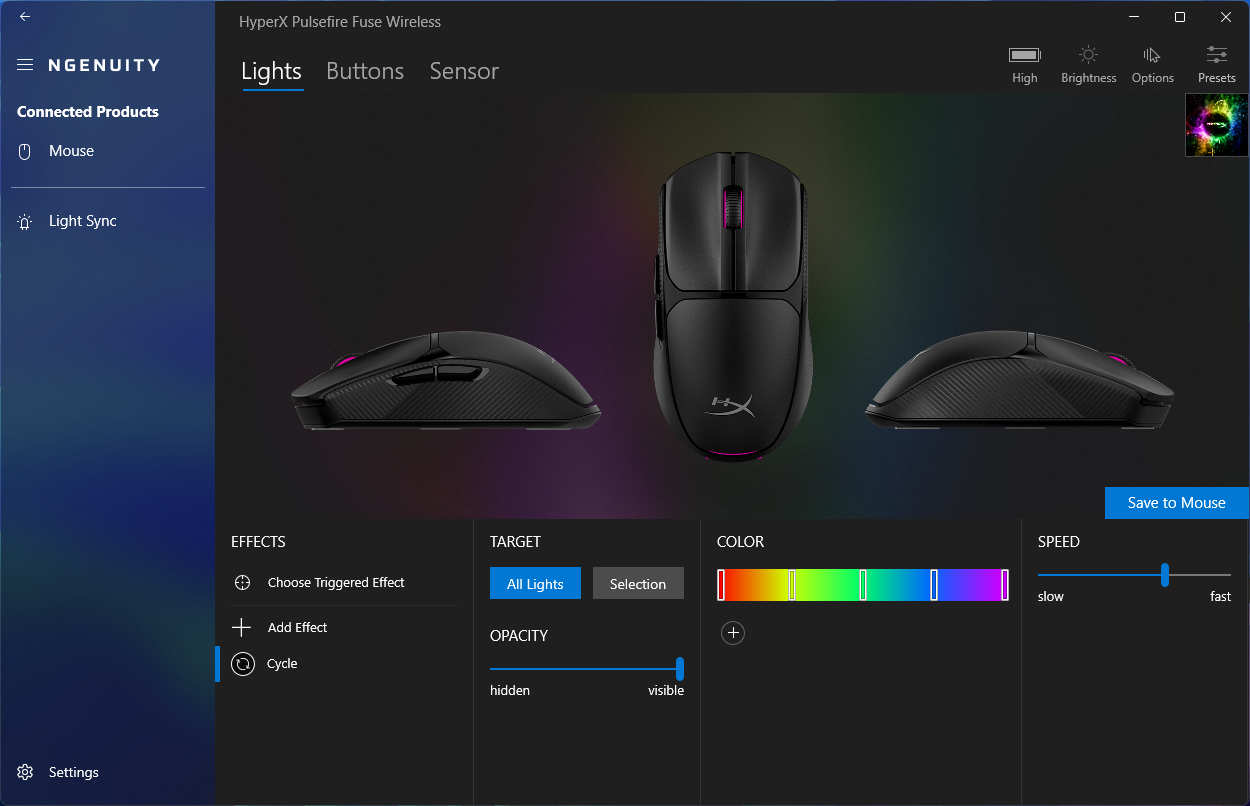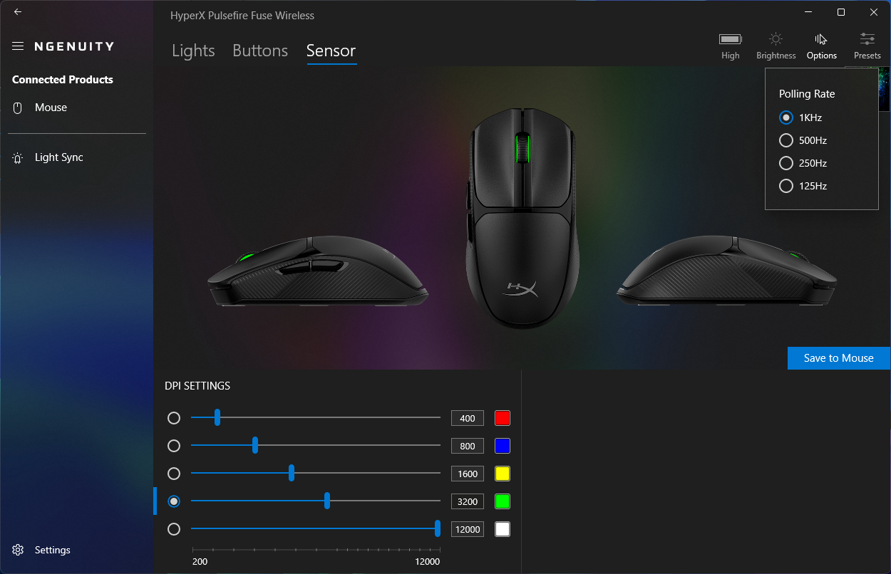 El Pulsefire Fuse Wireless funciona nada más sacarlo de la caja sin necesidad de software adicional. Para los que quieren más control, la aplicación HyperX Ngenuity ofrece personalización RGB y sincronización de dispositivos HyperX, reasignación de botones, ajustes de la tasa de sondeo, hasta cinco modos DPI personalizados y un almacenamiento de preajustes a bordo.
