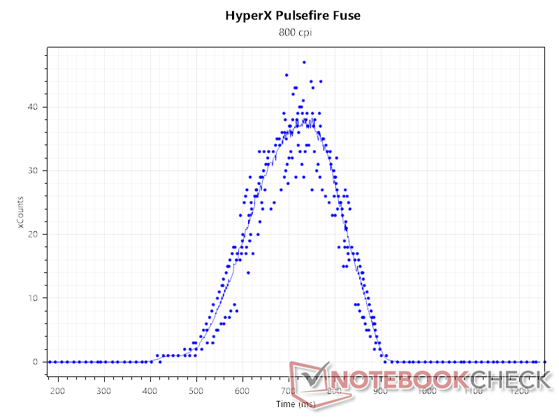 Con una frecuencia de sondeo de 1 kHz y 800 PPP, comprobamos que el PAW3311 de Fuse Wireless sigue un buen número de recuentos cerca de la curva central.