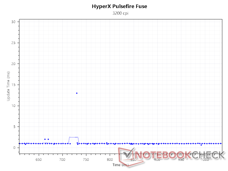 Encontramos que el Pulsefire Fuse Wireless mantiene una frecuencia de sondeo de 1.000 Hz bastante constante, aunque ocasionalmente puede tener picos por encima de 1.100 Hz durante unos 10 ms.