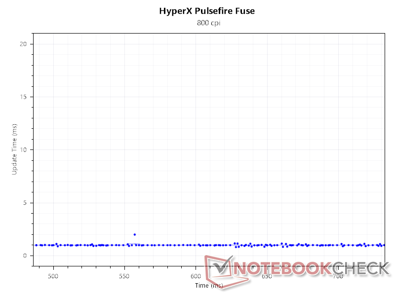 En consonancia con los gráficos de frecuencia de sondeo anteriores, comprobamos que el intervalo de actualización es sistemáticamente de 1 ms a 1.000 Hz y 800 PPP.