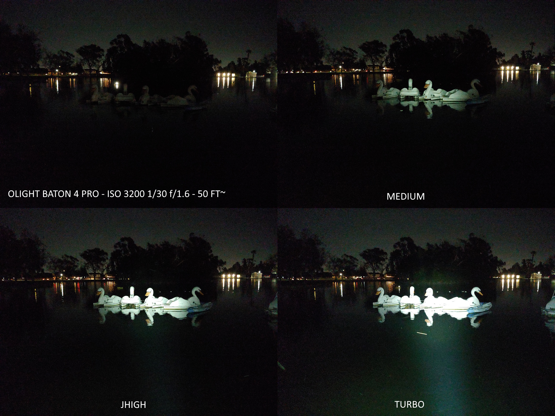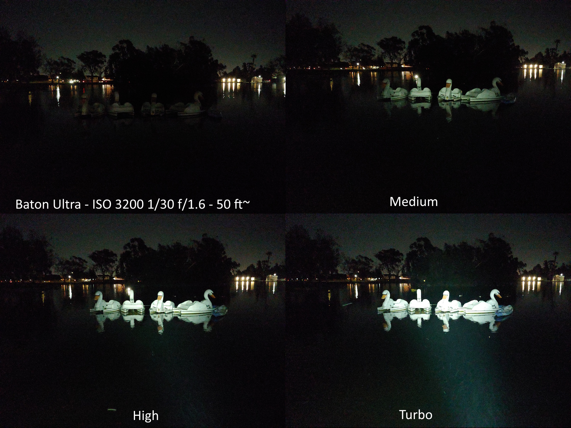 Las linternas Baton se probaron en sus tres modos más luminosos. Los botes cisne están a unos 15 m (50 pies) de distancia.