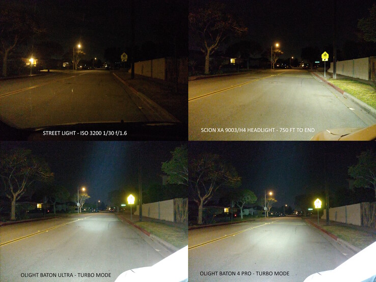 Las porras se probaron en modo turbo frente a los faros de coche 9003/H4. Fueron capaces de iluminar una calle residencial lo suficientemente bien como para circular por ella de noche, iluminando al menos 91 m de la carretera.