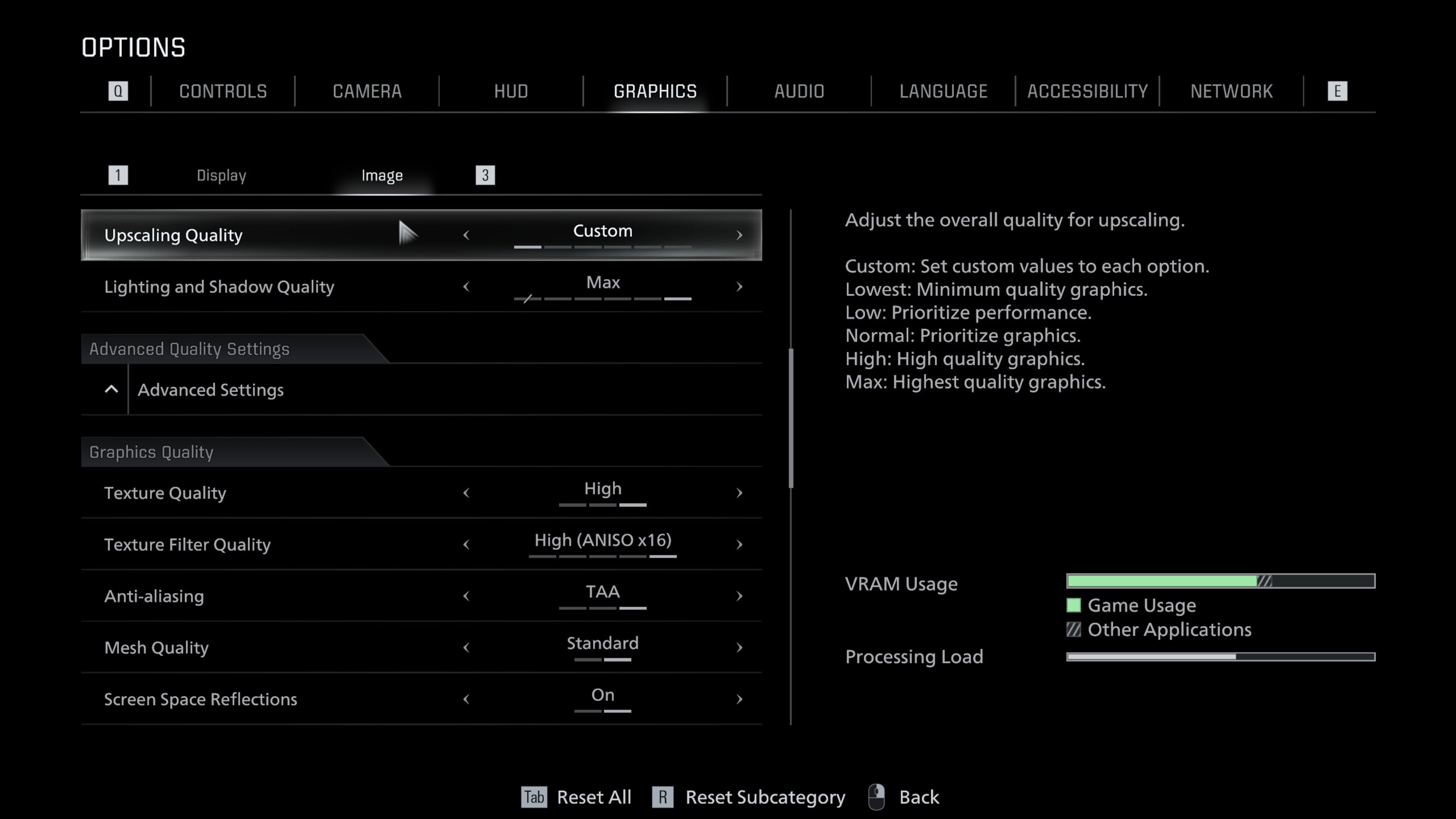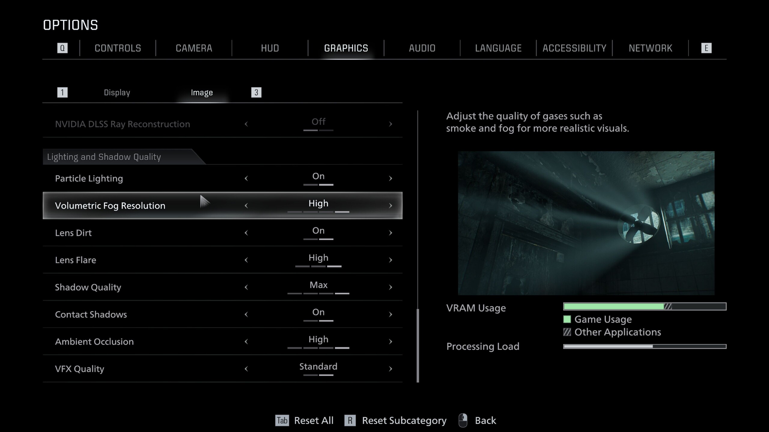 Puntos adicionales van al hecho de que los cambios realizados en el menú principal se aplican inmediatamente, sin necesidad de reiniciar. Las imágenes comparativas disponibles en algunas partes del menú de opciones y la lectura del uso de VRAM también merecen elogios. En cuanto a la VRAM, las tarjetas gráficas de 8 GB, como la GeForce RTX 5060, se utilizan al máximo con ajustes altos, y el rendimiento puede caer bruscamente con resoluciones más altas. Con 12 GB de VRAM o más, no observamos ningún problema.