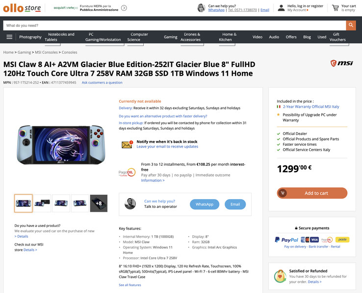 Como muestra la captura de pantalla inferior, Ollo Store ha puesto un precio a la Glacier Blue Edition de 1.299 euros (~1.520 dólares) con el mismo Core Ultra 7 258V procesador, 32 GB de RAM y 1 TB de almacenamiento que la variante Sandstorm que analizamos el año pasado. Para contextualizar, esta última se vende actualmente por 1.049 euros (~1.229 dólares) en Italia. Por desgracia, MSI no ha sugerido que vaya a vender estas placas laterales Glacier Blue por separado. Puede encontrar más detalles sobre la Glacier Blue Edition en el sitio web global de MSI.