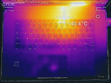 La temperatura externa no causa ninguna queja. Bajo carga, hay un punto caliente directamente encima de la CPU, pero incluso esto no se calienta incómodamente. El resto del chasis permanece bastante frío al tacto. La Tecra X50 se puede utilizar cómodamente en una vuelta durante la mayoría de las cargas de trabajo.