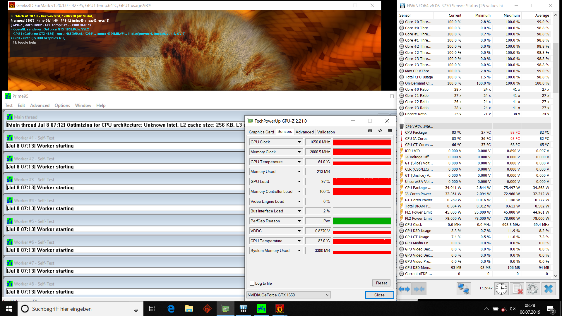 El Omen 15 completó nuestra prueba de esfuerzo (Prime95 y FurMark simultáneamente durante al menos una hora) de forma diferente en la red y en la batería. En la red, la CPU funcionó a 3,8 a 4 GHz durante un corto periodo de tiempo y luego redujo su velocidad de reloj a unos 3 GHz durante el resto de la prueba. La GPU comenzó en 1.710 MHz, que posteriormente se redujo a 1.650 MHz. En la batería, la CPU comenzó a 2,2 a 2,4 GHz y finalmente se estableció en 1,2 a 2 GHz, mientras que la GPU fluctuaba entre 600 y 1.600 MHz. Tenga en cuenta que esta prueba de esfuerzo es un escenario de carga extrema que rara vez ocurre en el mundo real. Realizamos esta prueba para determinar si un sistema permanece estable incluso con una carga máxima extrema.