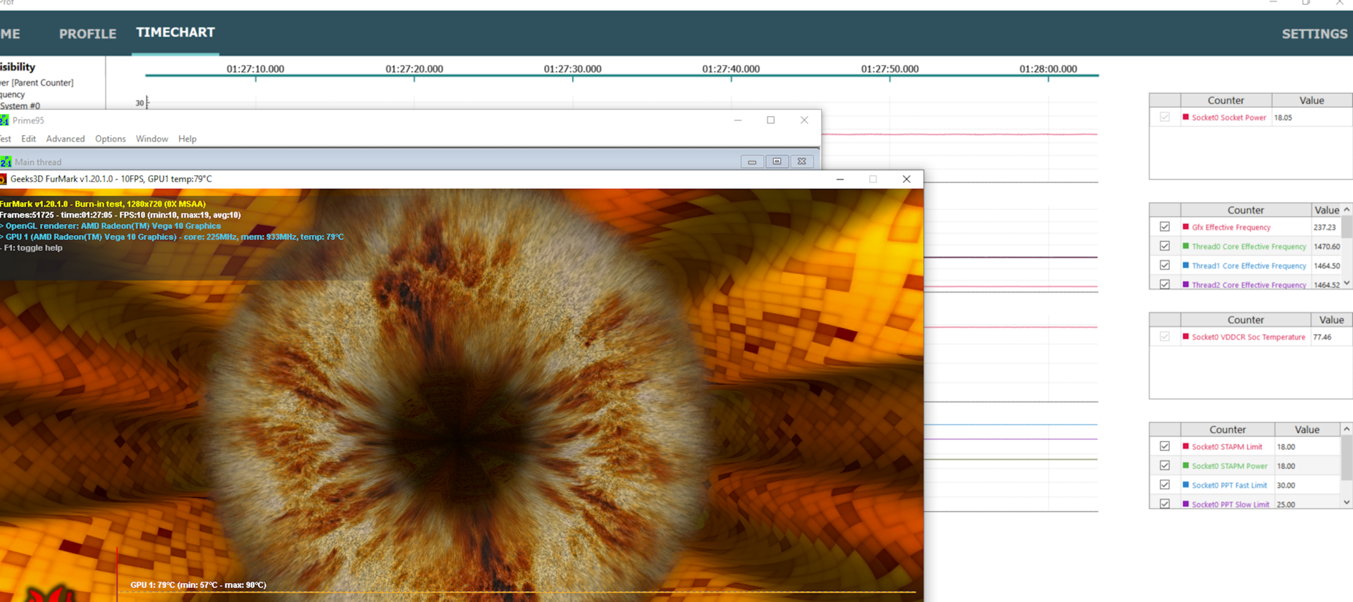 Durante la prueba de esfuerzo con Prime95 y FurMark, la CPU y la GPU deben compartir los 18 vatios de potencia de entrada. Por lo tanto, el procesador sólo funciona a 4x 1,4 - 1,5 GHz y la tarjeta gráfica a ~240 MHz y a una temperatura central de casi 78 °C (172 °F).