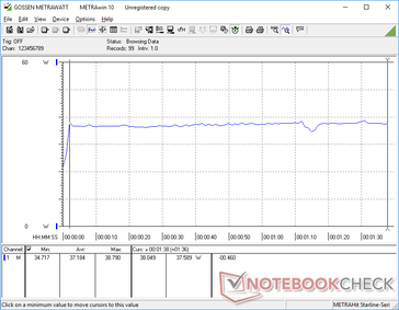 El consumo es ligeramente inferior al del portátil de superficie de 13,5 pulgadas 3 cuando está bajo carga y aproximadamente el mismo que el del Zenbook S UX393JA aunque este último viene con el Core i7-1065G7 que es casi dos veces más potente en términos de gráficos. Por lo tanto, el rendimiento por vatio no es tan bueno como esperábamos. Somos capaces de medir un consumo máximo temporal de 51,6 W del pequeño (~8,5 x 9 x 2,2 cm) adaptador de CA de 39 W. Observe que el Surface Laptop Go es compatible con los adaptadores de CA de 65 W que se envían con el Surface Laptop 3 más grande de 15 pulgadas.