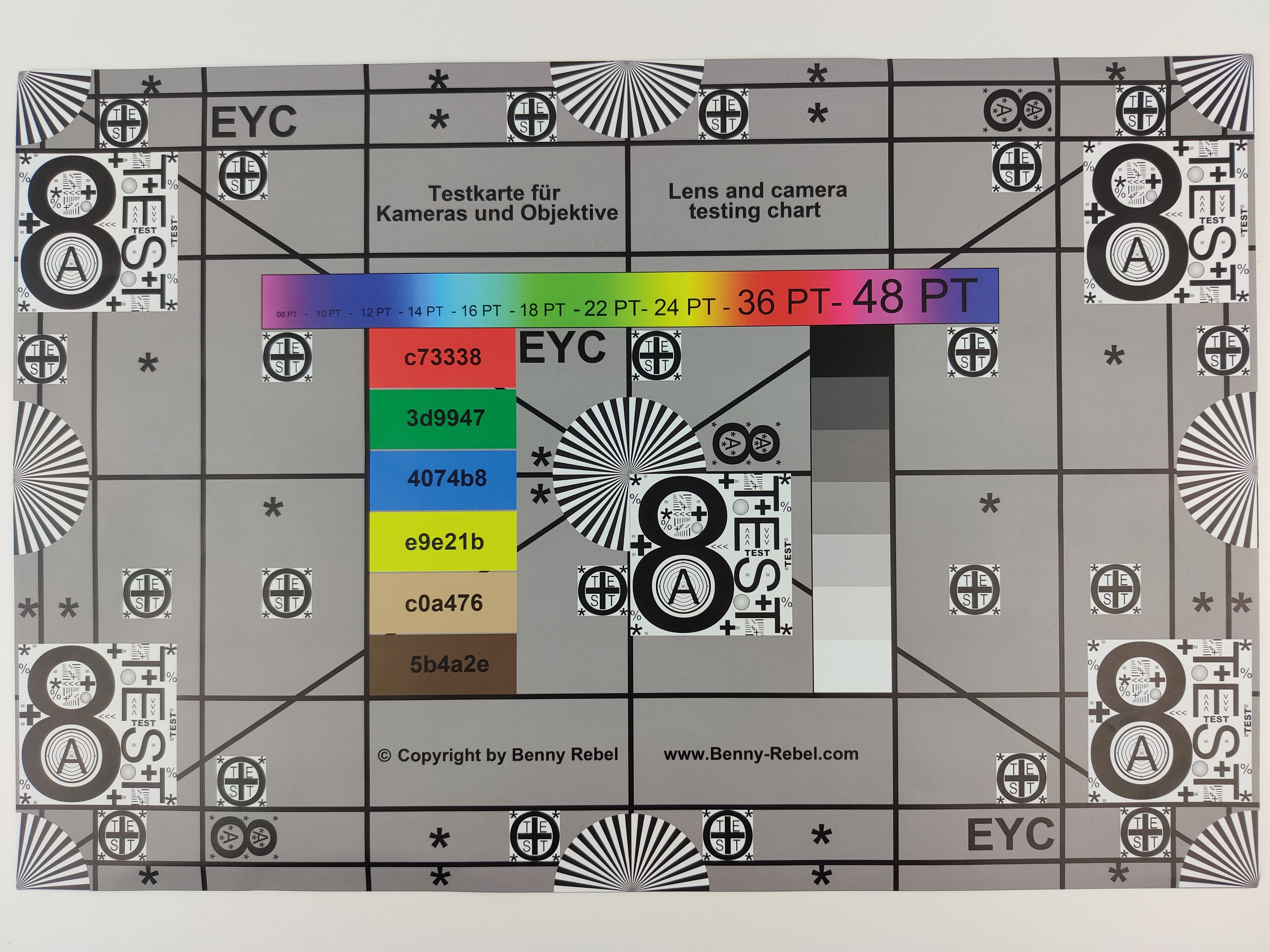 HauptkameraUltraweitZoom (5-fach)LowLightBajo condiciones de luz controlada, el pasaporte ColorChecker muestra que la cámara del OnePlus 8 sobreexpone fuertemente los colores en algunos casos. Mientras que están subexpuestos a un brillo ambiental de 1 lux, al menos permanecen visibles en su mayor parte. Lo mismo ocurre con el gráfico de prueba, y aunque también está subexpuesto, sólo las esquinas aparecen negras. Después de reajustar la iluminación a su estado original, los detalles y estructuras del gráfico de prueba se reconocen fácilmente y los colores se ven bien saturados. Sólo los colores de la parte inferior izquierda muestran una pequeña palidez.