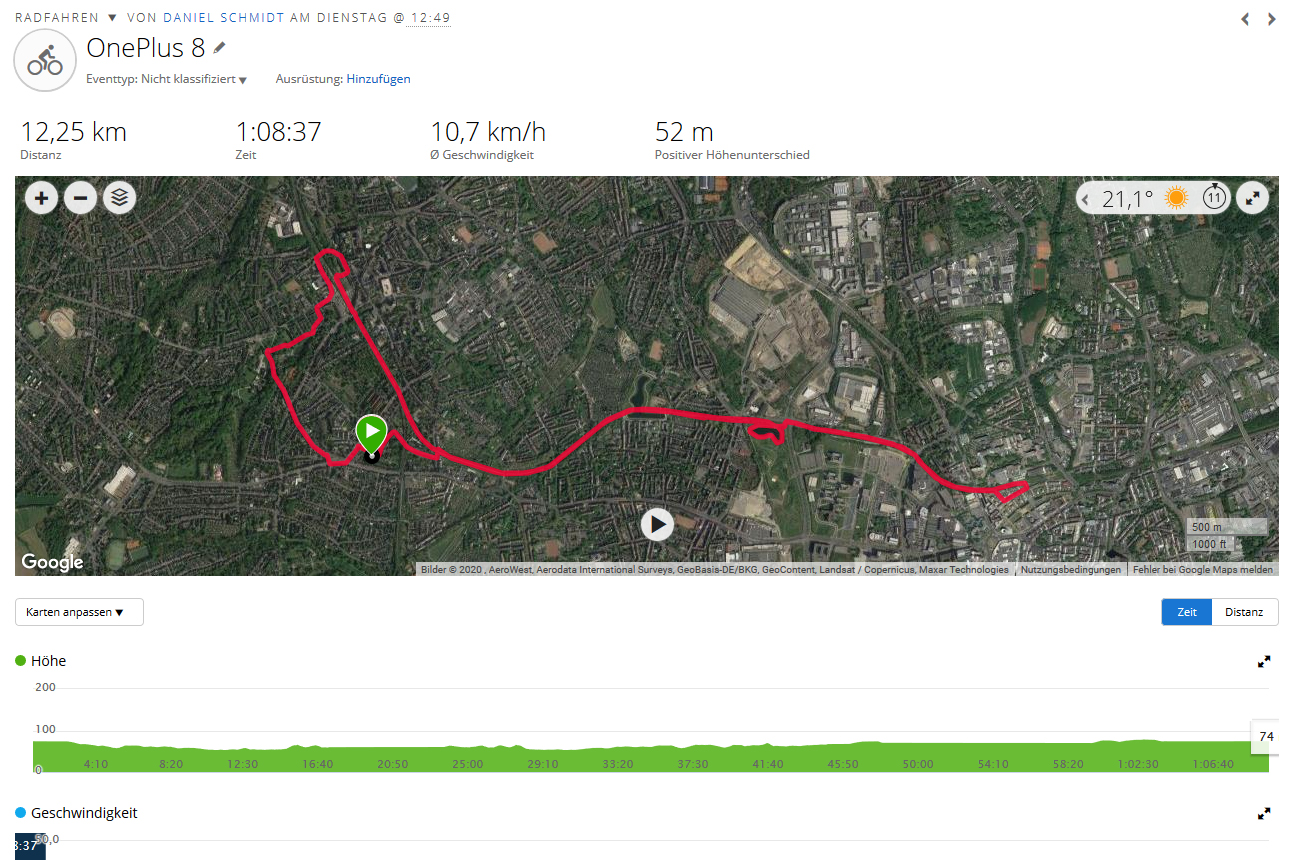 En nuestro paseo en bicicleta, el OnePlus 8 alcanza una precisión similar a la de nuestro dispositivo de referencia Garmin Edge 500. Como resultado, es muy adecuado para las tareas de navegación diarias.