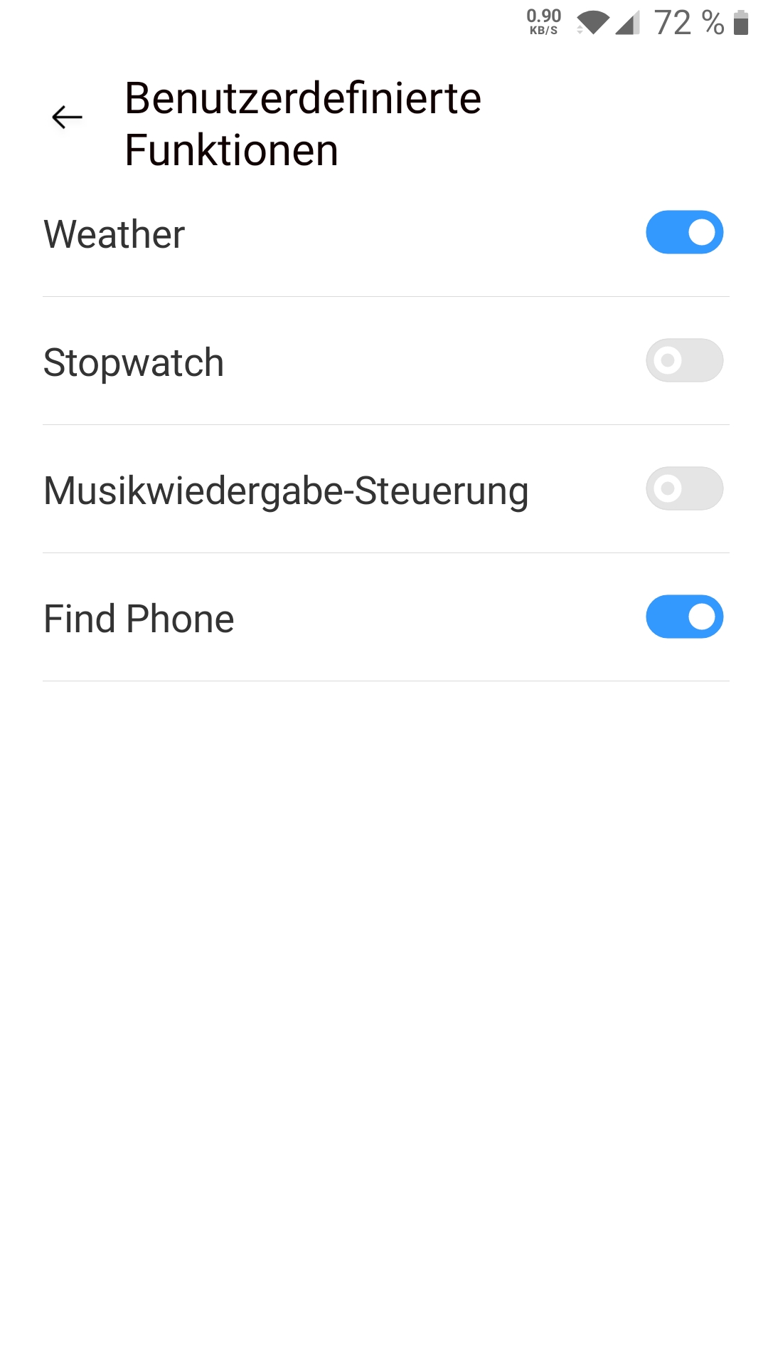 Se puede cambiar de una vista a otra con el botón sensor en el borde inferior de la pantalla. Una pulsación prolongada inicia funciones como Encontrar mi teléfono o el seguimiento de un entrenamiento y te lleva de la vista de actividad a una vista detallada. Esto funciona bien hasta ahora. Sin embargo, esta forma de funcionamiento es engorrosa para los controles del reproductor de música: Como no puedes tocar los controles directamente, primero tienes que tocar el botón del sensor varias veces para activar el control deseado, como por ejemplo "Siguiente pista", y luego volver a presionar el botón por largo tiempo para activar la acción.