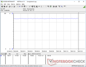 Los resultados son similares a los que grabamos en el Schenker XMG Neo 17 con un par de diferencias. El funcionamiento en vacío en el escritorio con todos los LEDs habilitados y Windows configurado en Alto Rendimiento consumiría alrededor de 32 W. Cuando se ejecuta Prime95 y FurMark simultáneamente, el consumo de energía también sería mayor a alrededor de 243 W del adaptador de CA de 230 W de tamaño mediano (~15,5 x 7,5 x 3 cm). Un adaptador más grande hubiera sido apreciado ya que el sistema no se recarga a una velocidad decente cuando se encuentra bajo un estrés extremo de procesamiento.