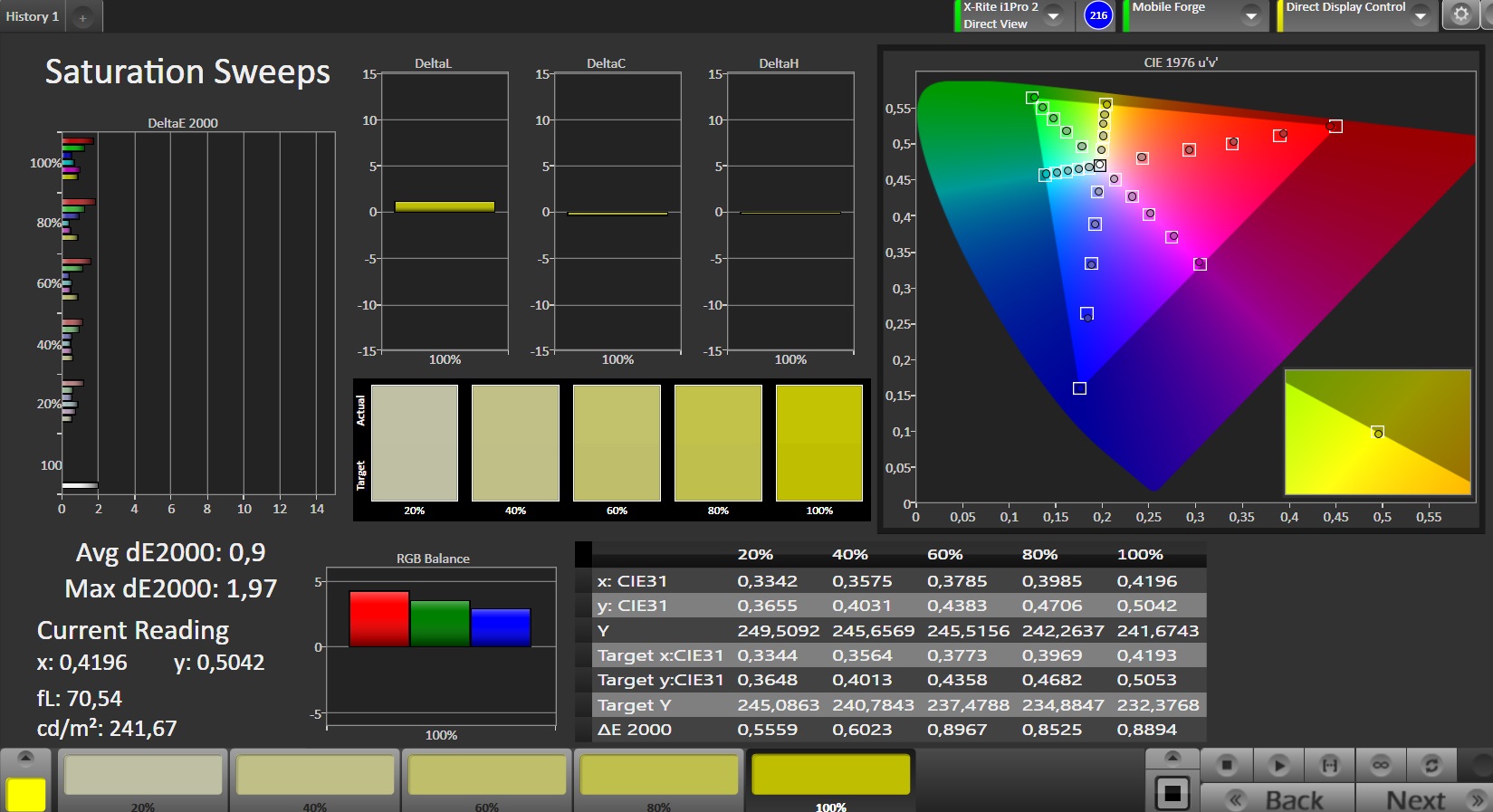 | Colorchecker dE 2000 * | 1.19 | 2.53 -113% | 1.17 2% | 2.7 -127% | 3 -152% | 0.9 24% |
