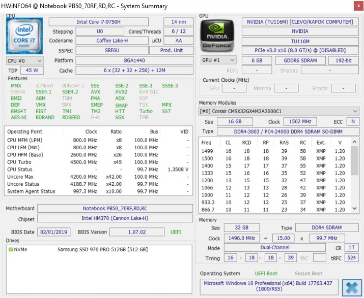 Nuestra configuración de prueba incluye 32 GB de RAM DDR4 de 2.666 MHz en modo de doble canal y una unidad SSD NVMe de 512 GB. El sistema funciona con el nuevo procesador Core i7-9750H de Intel, que en realidad es una versión de mayor reloj que el popular Core i7-8750H. El Core i7-9750H tiene un reloj base de 2,6 GHz y una velocidad de reloj turbo de 4,5 GHz, que son 400 MHz más altos que en los que funciona el Core i7-8750H. La Clevo PB51RC también tiene una pantalla mate Full HD que tiene una frecuencia de actualización de 144 Hz. El dispositivo renuncia a G-Sync por NVIDIA Optimus, lo que le permite cambiar entre gráficos Intel y NVIDIA. Hemos emparejado la Clevo PB51RC con una pantalla externa UHD para nuestras pruebas QHD y 4K, como referencia.
