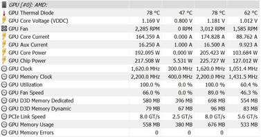 La GPU funciona a 300 MHz en ralentí y consume un promedio de 6-8 vatios en este escenario. HWiNFO midió un consumo máximo de 184 vatios durante nuestra prueba de esfuerzo. Esto sitúa el consumo del XFX Radeon RX 590 Fatboy OC+ ligeramente por encima de los tipos de referencia. Pero esto está conectado a las mayores velocidades de reloj de la GPU. Los usuarios podrían intentar sacar aún más provecho del chip aumentando el objetivo de potencia. Sin embargo, el sistema de refrigeración pronto no puede seguir el ritmo. Sólo pudimos hacer overclocking adicional de la RX 590 desde el XFX en 20 MHz, mientras que obtuvimos 200 MHz adicionales de la VRAM. En general, esta mejora del rendimiento no se traduce en mejores puntos de referencia sintéticos. La GPU también consumió mucha más energía con estos ajustes manuales de OC (225 vatios). Los usuarios que buscan sacar más provecho de su tarjeta gráfica tendrán que estudiar la refrigeración por líquido. El overclocking de nuestra versión de prueba no vale la pena con el sistema de refrigeración estándar del XFX Radeon RX 590 Fatboy OC+.
