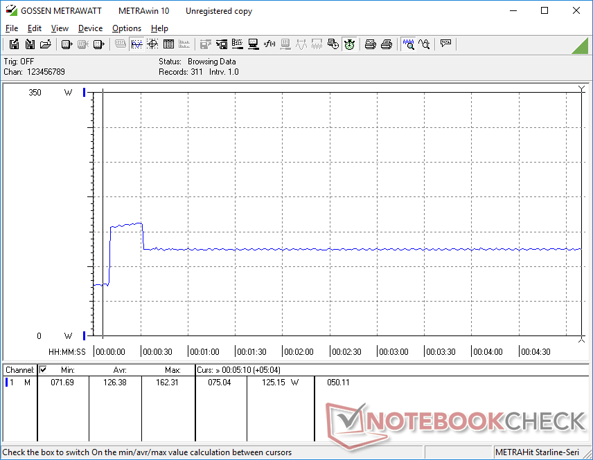 Podemos registrar un consumo máximo de 257 W cuando se utiliza tanto Prime95 como FurMark simultáneamente desde el adaptador de CA de 280 W de tamaño mediano (~18 x 8,5 x 3,5 cm). Este alto de un sorteo eventualmente cae después de unos 20 segundos para ser similar a nuestras observaciones de velocidad de reloj durante la prueba de esfuerzo de Prime95 anterior.