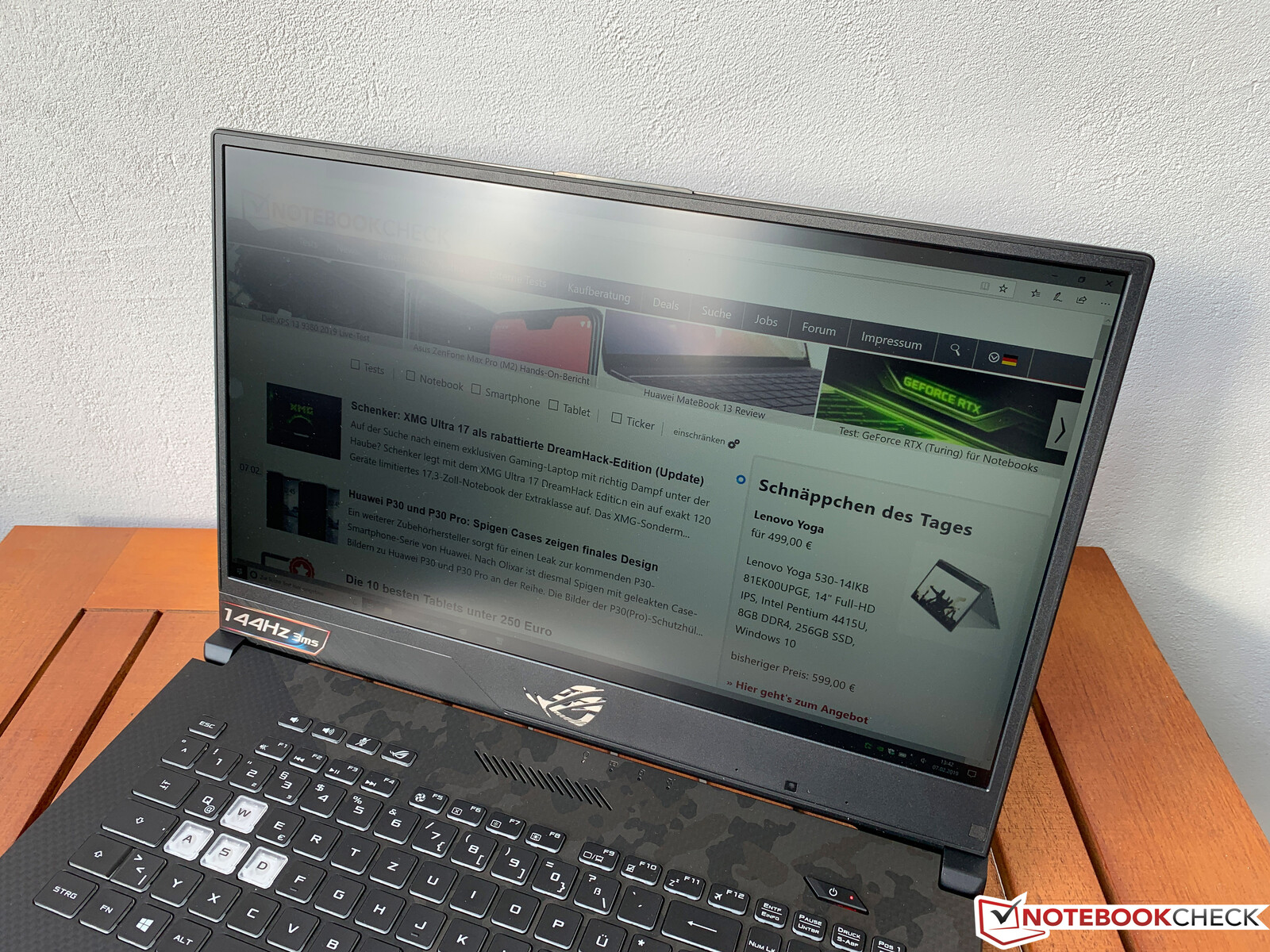 El GL704GW también se puede utilizar en exteriores gracias a su pantalla mate, pero nos cuesta leerlo bajo la luz directa del sol ya que la pantalla parece desgastada. Por lo tanto, le recomendamos que busque un lugar con sombra, siempre que sea posible. Sin embargo, no debería tener problemas para usar el GL704GW al aire libre en un día nublado.