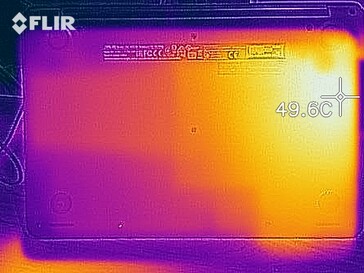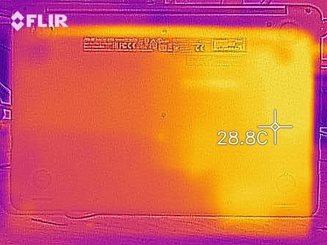 En nuestra prueba, las superficies de la Asus E203MA alcanzan temperaturas de unos 24 °C (75,2 °F) en reposo y un máximo de 42 °C (107,6 °F) bajo carga. El pequeño portátil se siente simplemente caliente y se puede utilizar fácilmente en el regazo / muslos.